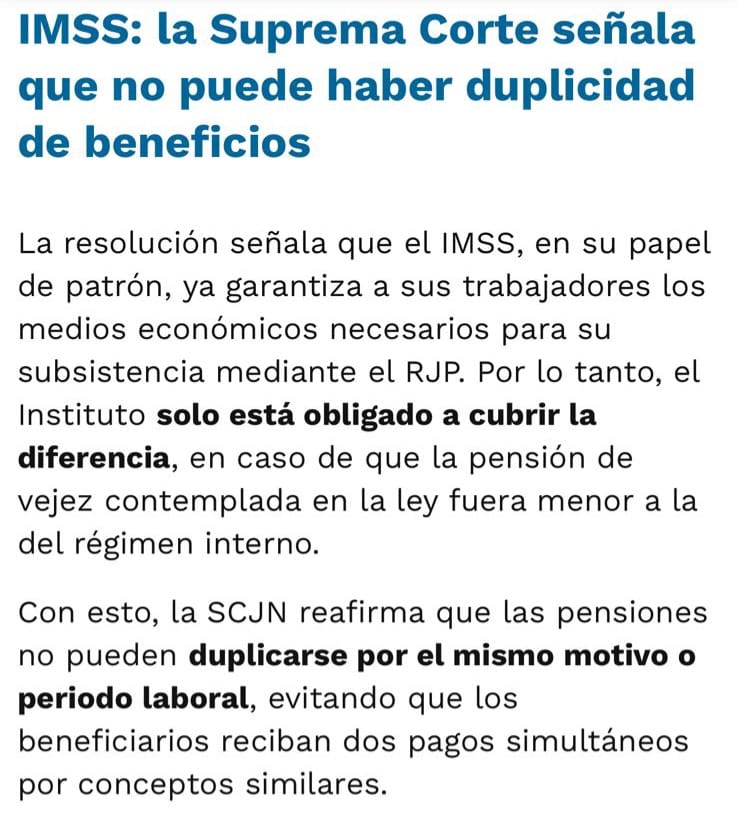La resolución reciente de la Suprema Corte de Justicia de la Nación (SCJN) sobre el régimen de pensiones del Instituto Mexicano del Seguro Social (IMSS) ha encendido las alarmas en todo el país. El máximo tribunal determinó que los trabajadores del propio Instituto que ya reciben una jubilación bajo el Régimen de Jubilaciones y Pensiones (RJP) no podrán cobrar también la pensión de vejez establecida por la Ley del Seguro Social. El argumento es claro: no puede haber duplicidad de beneficios por el mismo concepto.